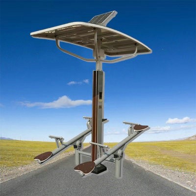 器材采用优良的钢材,器材顶部为防雨伞棚,顶棚材质为铝塑板,太阳能板电池采用多晶硅太阳能电池板,一次性充满可使用70小时,固定显示屏显示,在运动过程中实时记录并显示运动时间,运动次数,运动频率、消耗卡路里等运动数据。器材整体静电喷塑。